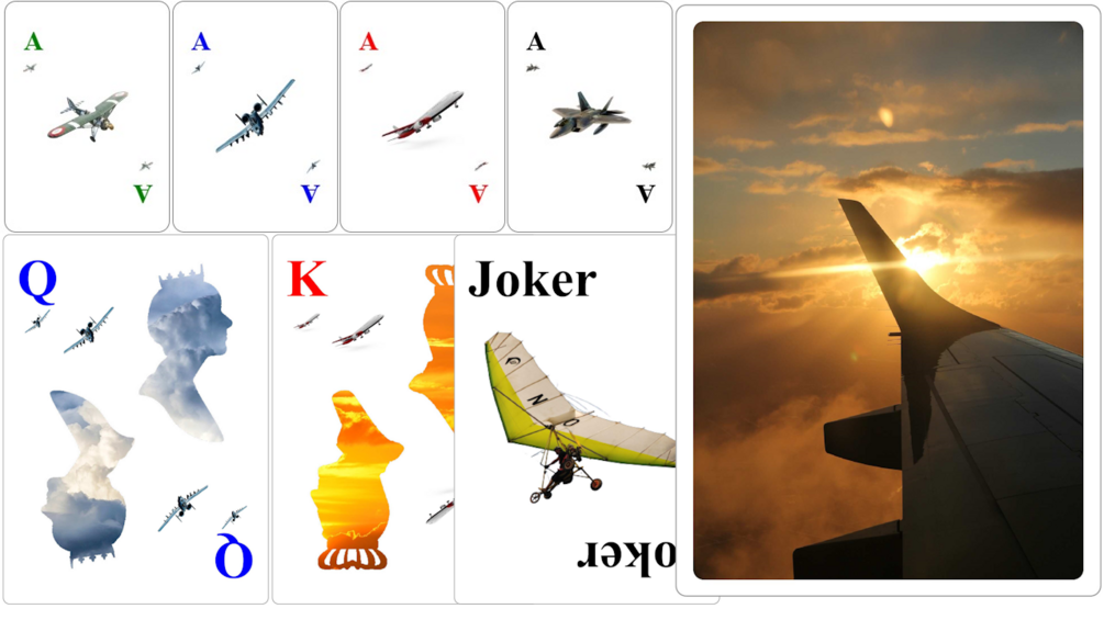 Deck design of wine-themed playing cards, where the suits are not the typical clubs, diamonds, hearts, or spades, but instead are: Japanese Zeros, A-10 Warthogs, Commercial Airliners, and F-22 figher jets. A hang-glider and hobby aircraft are the jokers. All card backs are a stunning wing-view of a sunset.