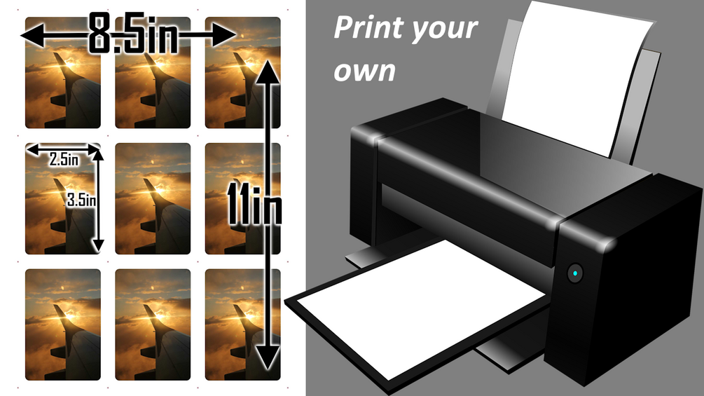 - 2.5in x 3.5in poker-sized cards in a 3x3 (9 cards per page) printable 8.5x11 paper size for self-printing.