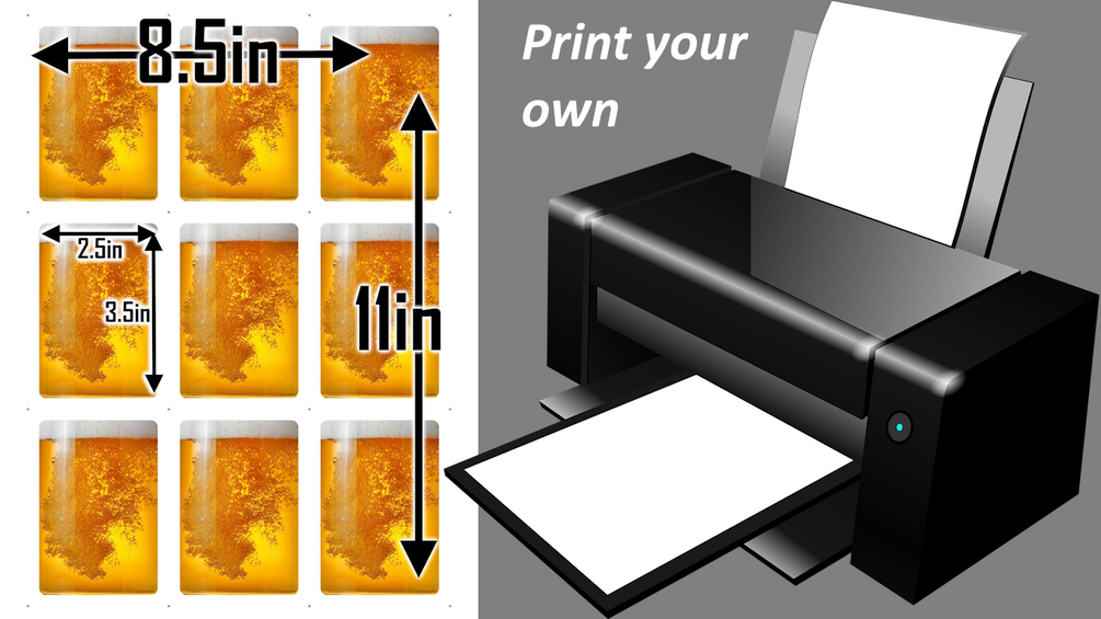 - 2.5in x 3.5in poker-sized cards in a 3x3 (9 cards per page) printable 8.5x11 paper size for self-printing.