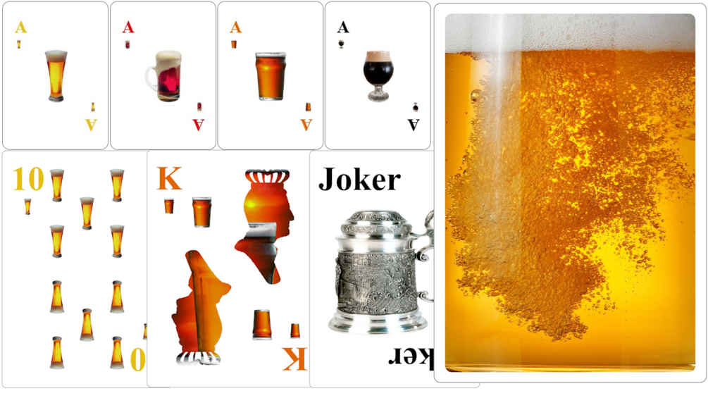 Deck design of wine-themed playing cards, where the suits are not the typical clubs, diamonds, hearts, or spades, but instead are: golden beer, amber IPAs, brown ales, and black stouts. Two beer stein mugs are the jokers. All card backs are glorious golden suds.