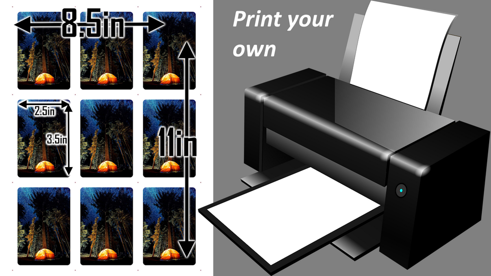 - 2.5in x 3.5in poker-sized cards in a 3x3 (9 cards per page) printable 8.5x11 paper size for self-printing.