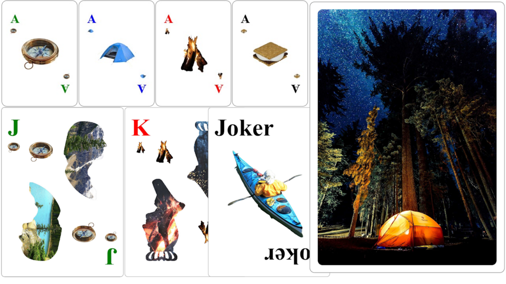 Deck design of wine-themed playing cards, where the suits are not the typical clubs, diamonds, hearts, or spades, but instead are: a compass, tent, fire pit, and smores. A mountain bike and a kayak are the jokers. All card backs are cozy camping star-covered nightscape.