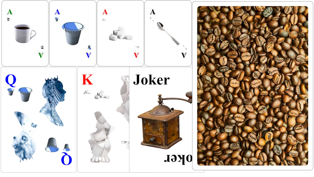 Deck design of wine-themed playing cards, where the suits are not the typical clubs, diamonds, hearts, or spades, but instead are: cups of coffee, creamers, sugar cubes, and spoons. Two antique coffee bean grinders are the jokers. All card backs are glorious roasted coffee beans.