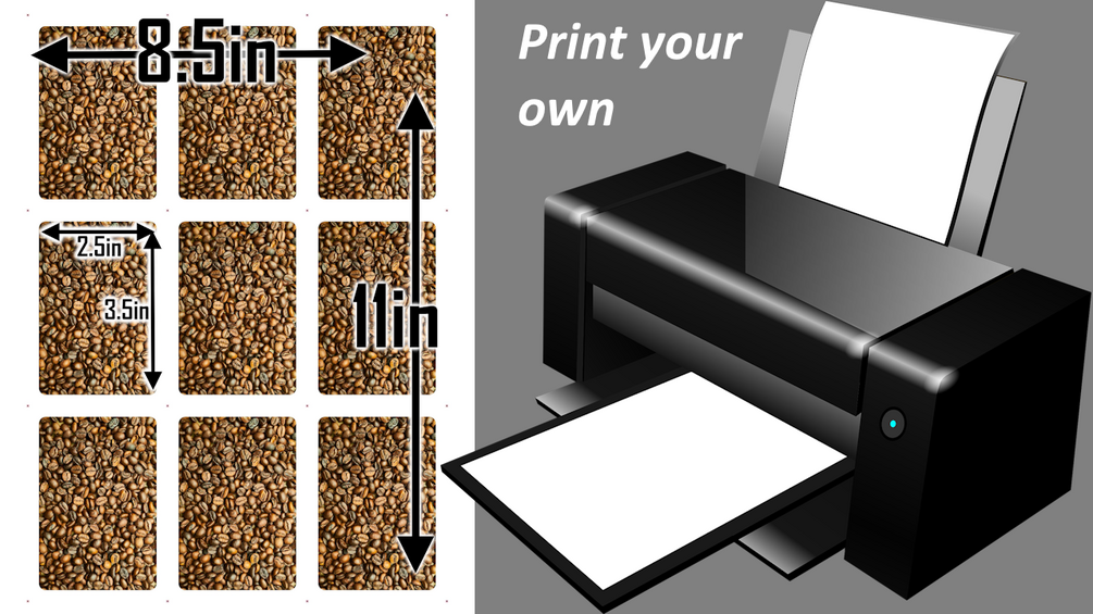 - 2.5in x 3.5in poker-sized cards in a 3x3 (9 cards per page) printable 8.5x11 paper size for self-printing.