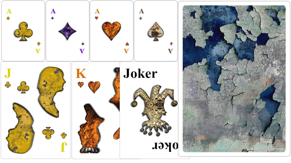Deck design of wine-themed playing cards, where the suits are not the typical clubs, diamonds, hearts, or spades, but instead are: flakey yellow, toxic orange, putrid purple, and rusty grey. Two golden and polished silver joker faces are the jokers. All card backs are beautiful wine barrels.