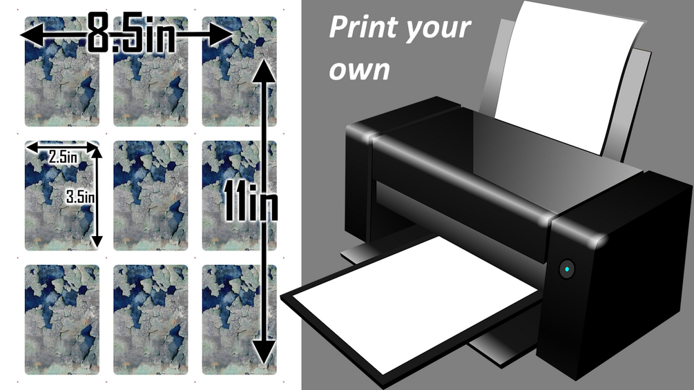 - 2.5in x 3.5in poker-sized cards in a 3x3 (9 cards per page) printable 8.5x11 paper size for self-printing.