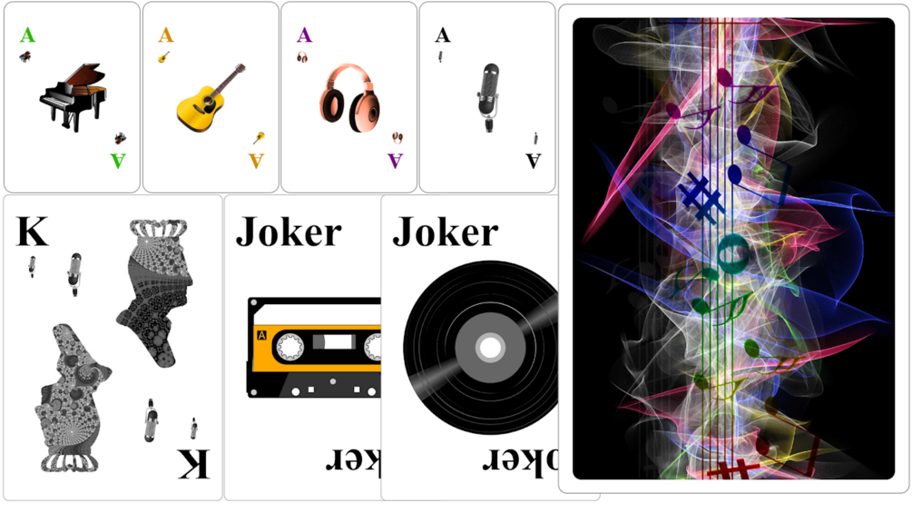 Deck design of music-themed playing cards, where the suits are not the typical clubs, diamonds, hearts, or spades, but instead are: pianos, guitars, headphones, and microphones. A record and cassette tape are the jokers. All card backs are whimsical musical notes.