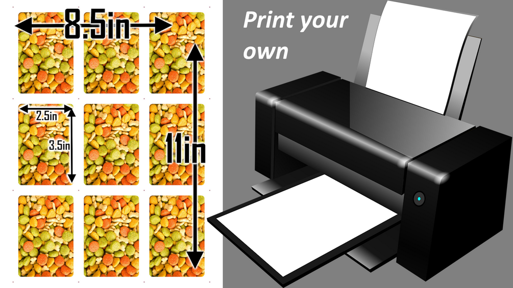 - 2.5in x 3.5in poker-sized cards in a 3x3 (9 cards per page) printable 8.5x11 paper size for self-printing.