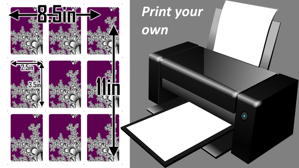 - 2.5in x 3.5in poker-sized cards in a 3x3 (9 cards per page) printable 8.5x11 paper size for self-printing.