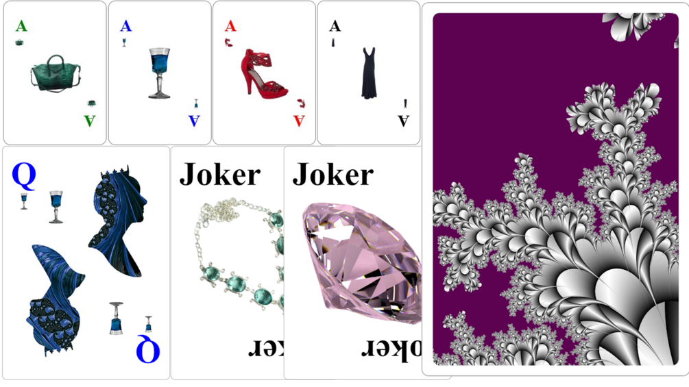 Deck design of wine-themed playing cards, where the suits are not the typical clubs, diamonds, hearts, or spades, but instead are: shoes, handbags, black dresses, and a cocktail. A diamond necklace and gem necklace are the jokers. All card backs are a stylish sparkling fashion statement.