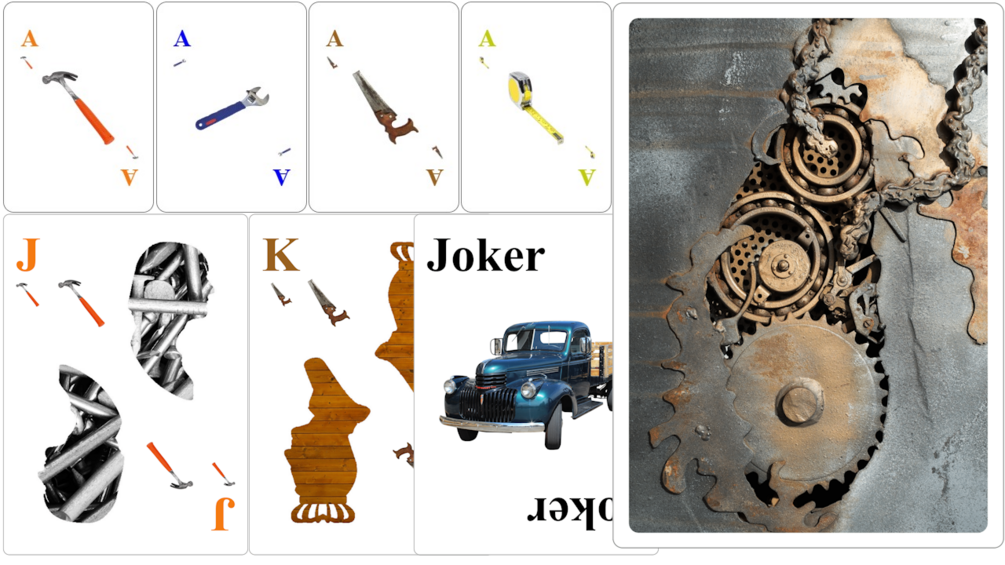 Deck design of wine-themed playing cards, where the suits are not the typical clubs, diamonds, hearts, or spades, but instead are: a hammer (and nails), a wrench (and nuts), a saw (and wood), and a tape measure. A sports car and a vintage truck are the jokers. All card backs are mechanical gears.