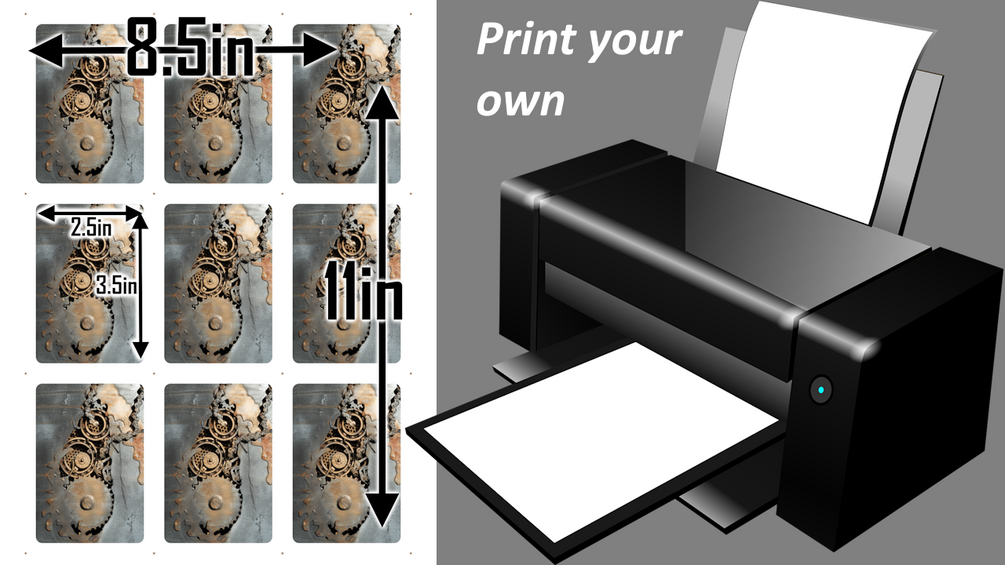 - 2.5in x 3.5in poker-sized cards in a 3x3 (9 cards per page) printable 8.5x11 paper size for self-printing.