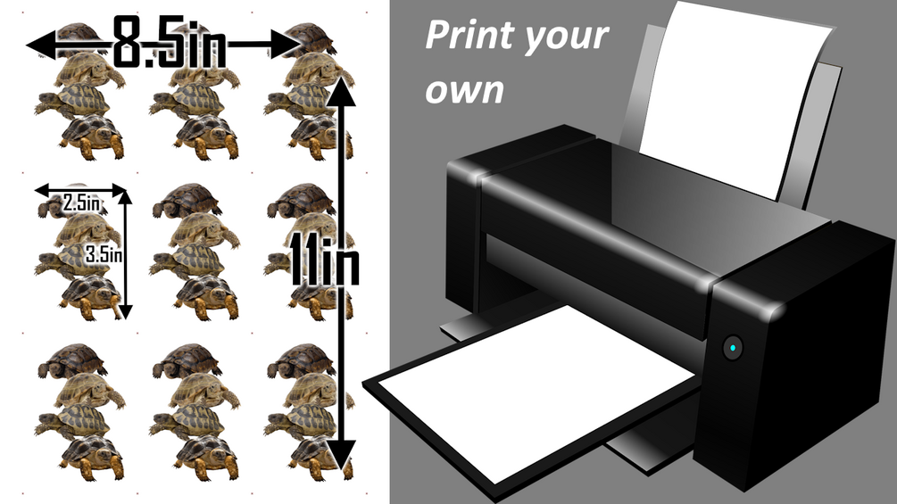 - 2.5in x 3.5in poker-sized cards in a 3x3 (9 cards per page) printable 8.5x11 paper size for self-printing.