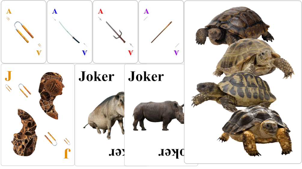 Deck design of wine-themed playing cards, where the suits are not the typical clubs, diamonds, hearts, or spades, but instead are: nunchucks, swords, sais, and bostaffs. A warthog and rhinocerous are the jokers. All card backs are four turtles.