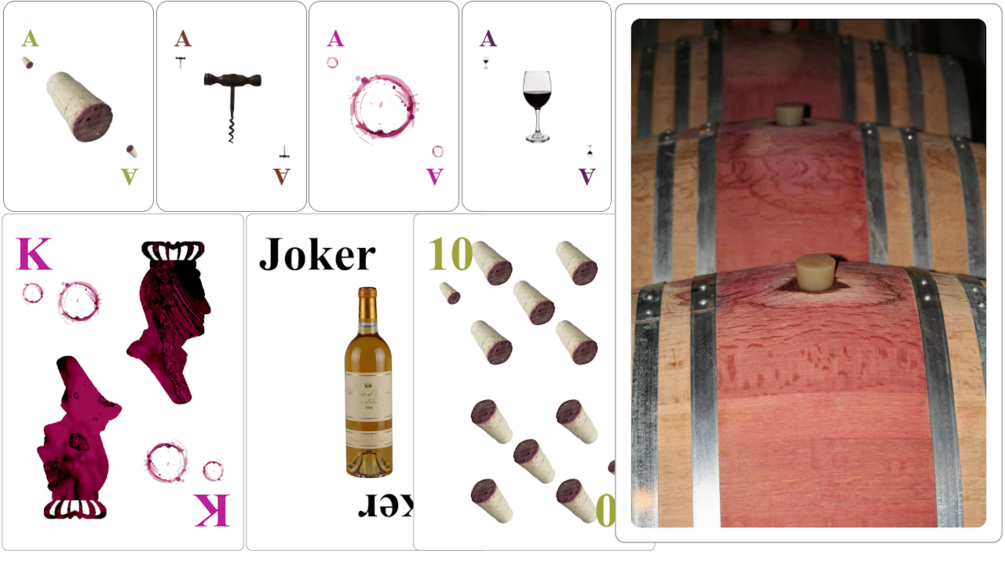 Deck design of wine-themed playing cards, where the suits are not the typical clubs, diamonds, hearts, or spades, but instead are: corks, corkscrews, wine splashes, and glasses of red wine. Two full bottles of white and rose wine are the jokers. All card backs are beautiful wine barrels.